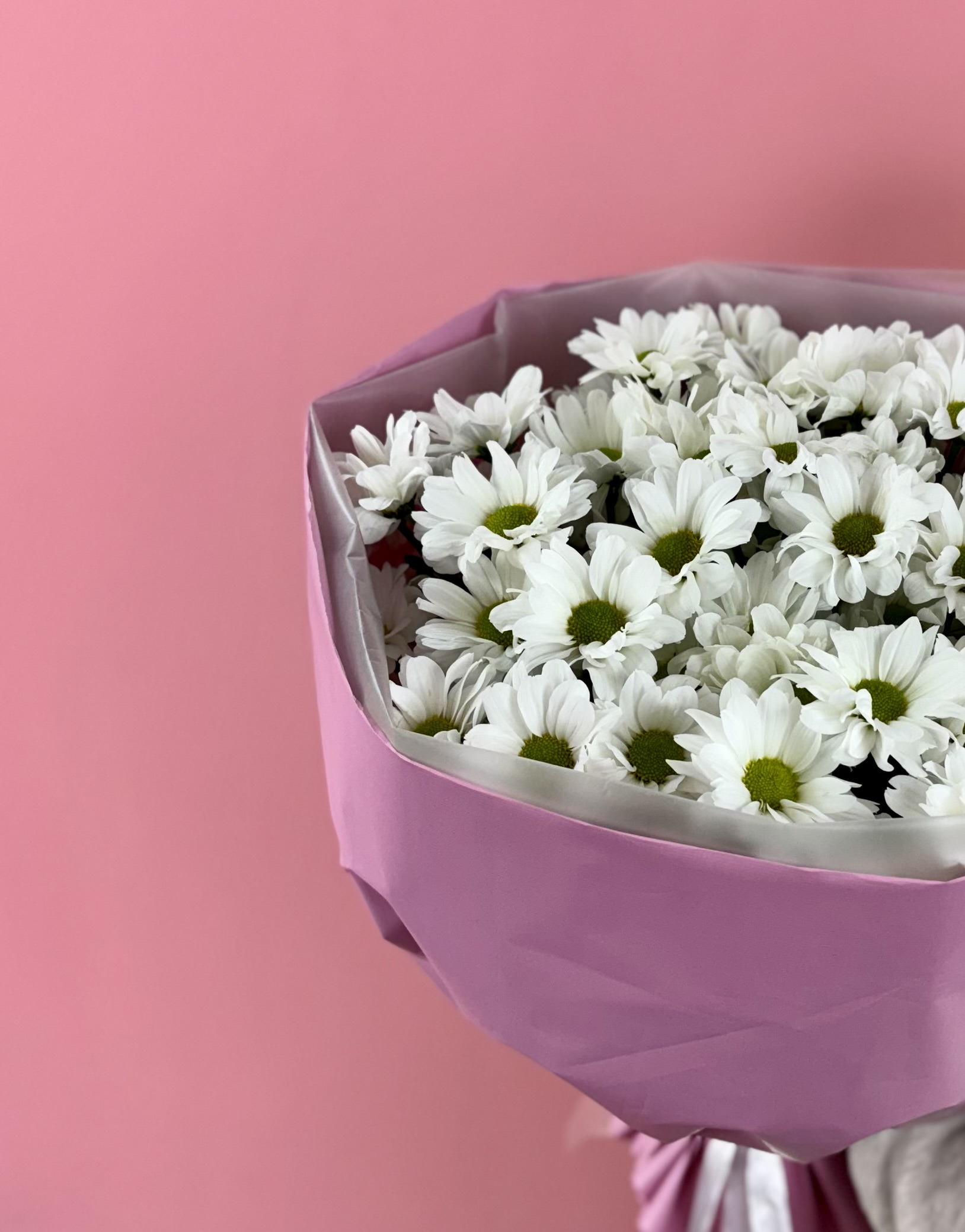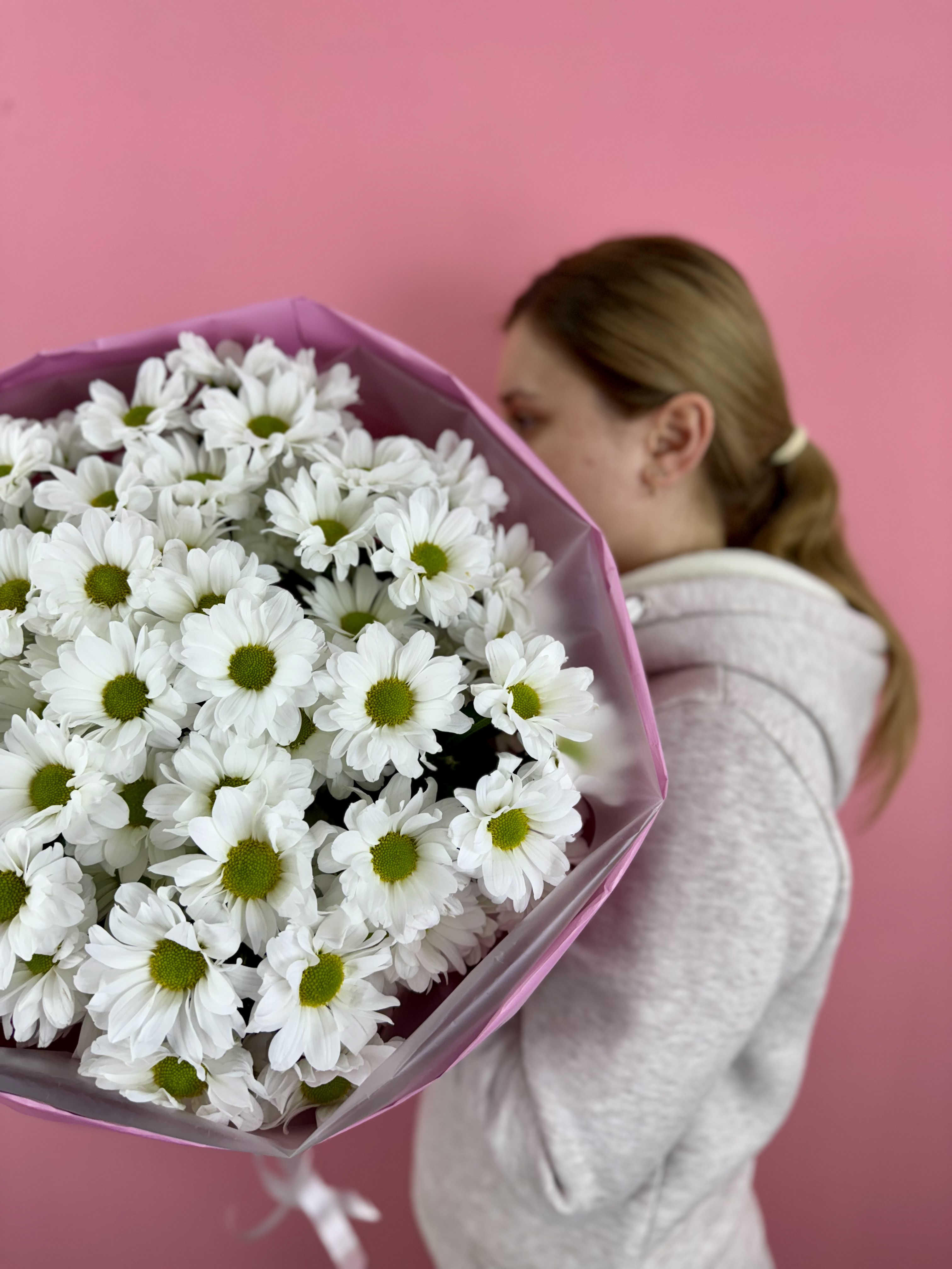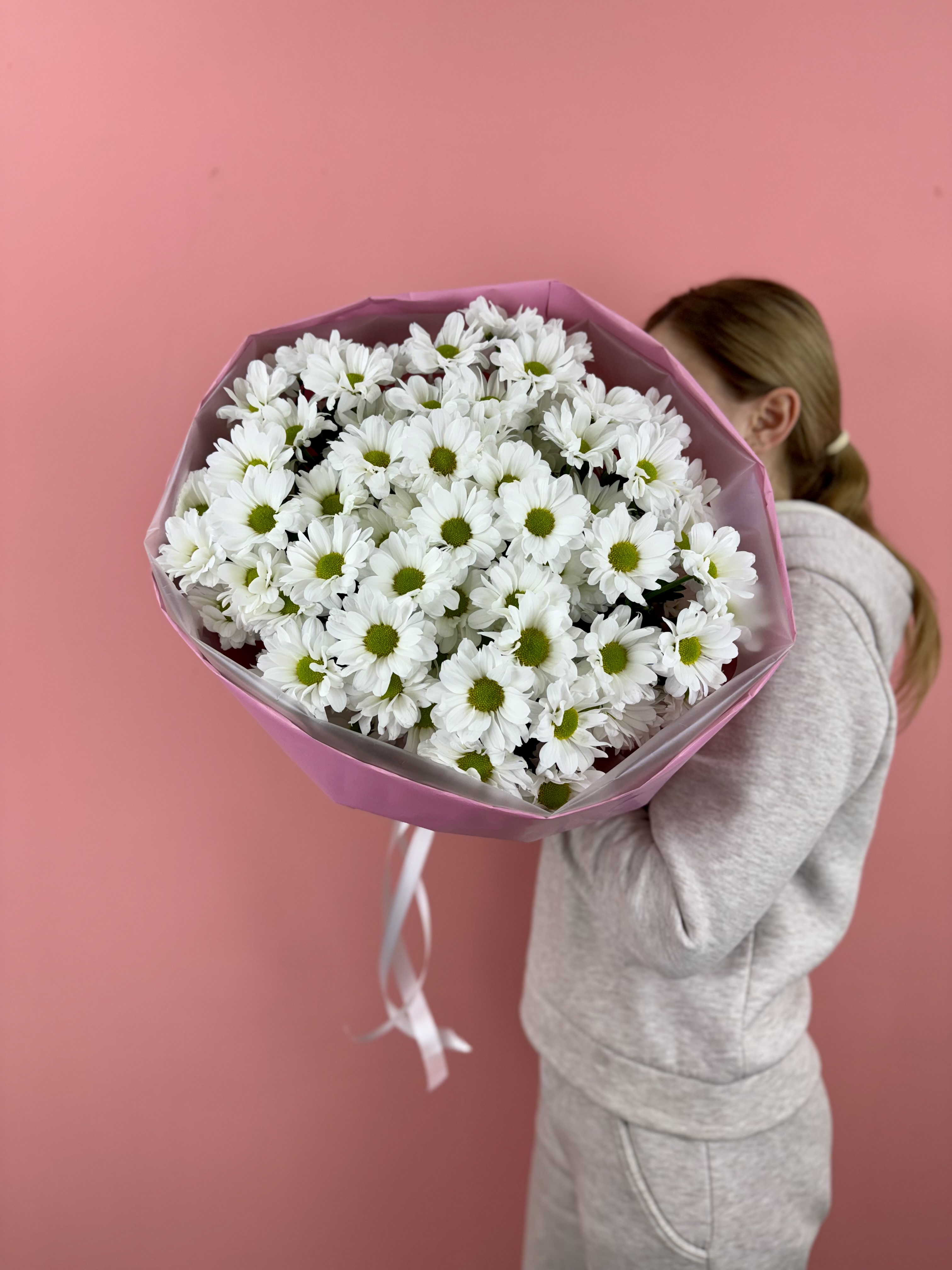 Моно букет из 9 кустовых хризантем ромашка, в двойной корейской упаковке конфетка