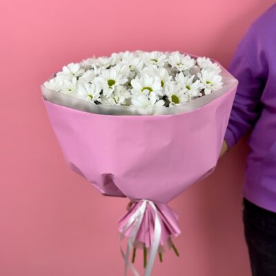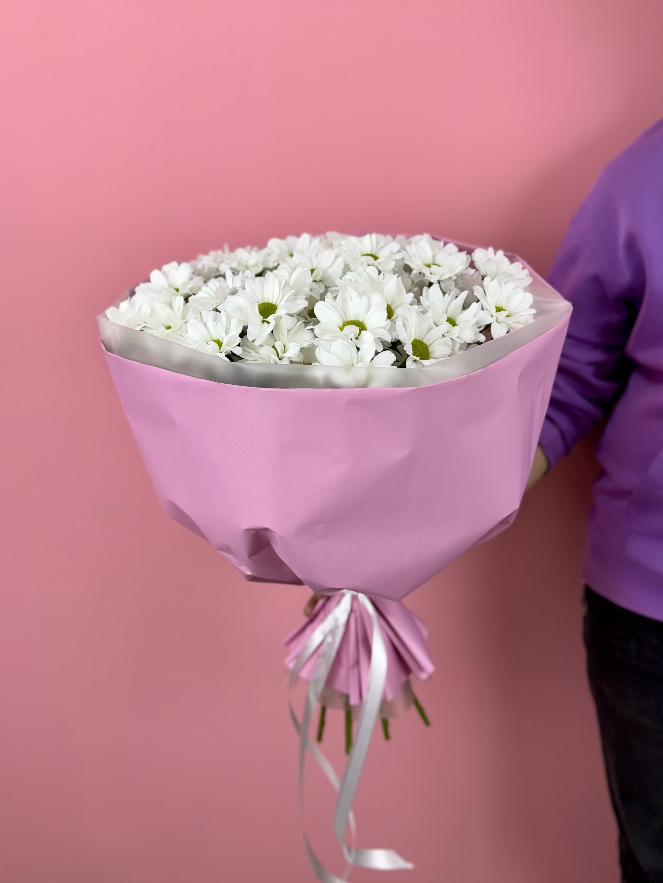 Моно букет из 9 кустовых хризантем ромашка, в двойной корейской упаковке конфетка